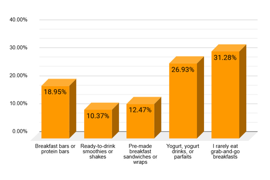 • Grab-and-go breakfast adoption is selective, with yogurt-based options leading the category (26.9%), while nearly one-third of consumers still rarely rely on convenience breakfast products, suggesting growth potential for portable formats.