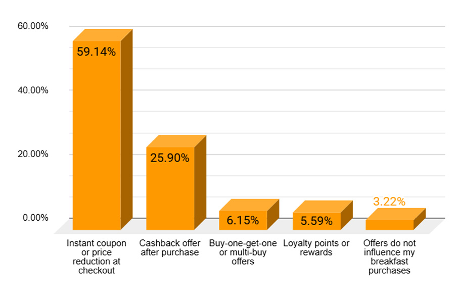 The results also highlight the powerful role promotions play in the category. The majority of consumers say coupons or cashback offers influence their breakfast choices and significantly increase their willingness to try new products.